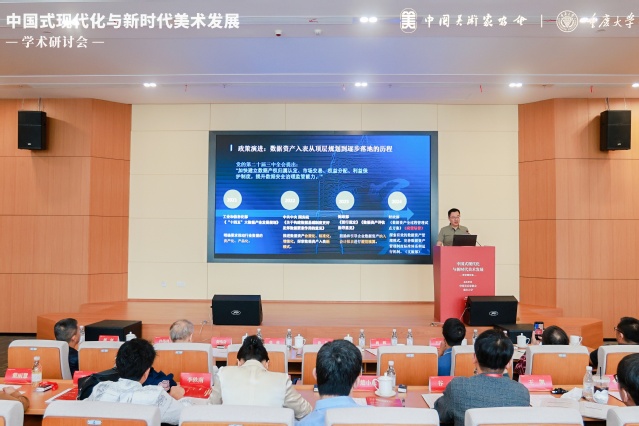 俞锋作题为《文化数据资产入表:赋能新质生产力发展的内在机理与实践路向》的主旨报告。报告以国家战略视角代入当下数据资产的契机与思考,分别从政策演进视角剖析数据资产入表的发展历程,以及新质生产力视角剖析数据作为生产要素的重要价值。报告深度研究了文化数据资产入表的内在机理与发展路径,让现场学者与师生深受启发,打开了新时代美术发展研究与实践的新思路。