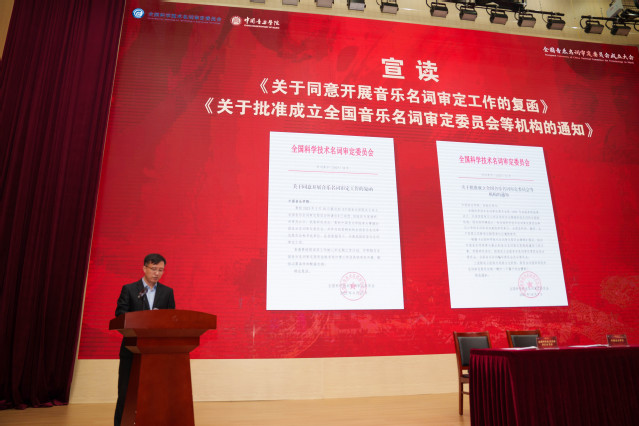 全国科学技术名词审定委员会事务中心副主任张晖宣读《关于同意开展音乐名词审定工作的复函》及《关于批准成立全国音乐名词审定委员会等机构的通知》,确认授权中国音乐学院为全国音乐名词审定委员会秘书处单位,在全国科技名词委的指导下开展我国音乐名词审定工作,并批准成立全国音乐名词审定委员会及分委员会、全国音乐名词编写委员会及分委员会。