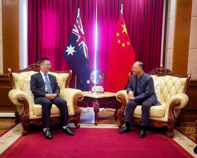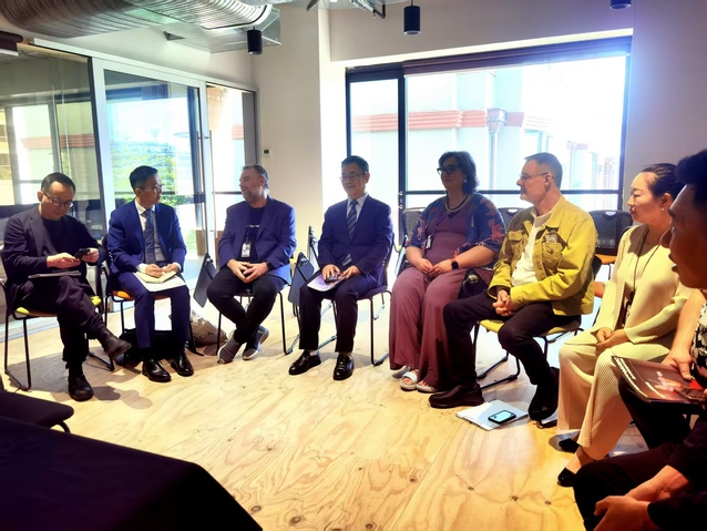 在墨尔本,俞锋拜访了中国驻墨尔本总领事馆,与总领事房新文、教育参赞丁莉等就进一步加强中澳人文艺术交流进行了广泛而深入的探讨。房新文指出,总领馆将全力支持南艺与澳洲高校在人文艺术领域的深度合作,特别期待双方未来在汉字艺术设计展、中国传统民族音乐演出等能够充分彰显文化自信、促进文明对话的项目上结出硕果,共同绘制中澳文化交流精谨细腻的“工笔画”,为两国关系的繁荣发展增添绚丽的艺术色彩。