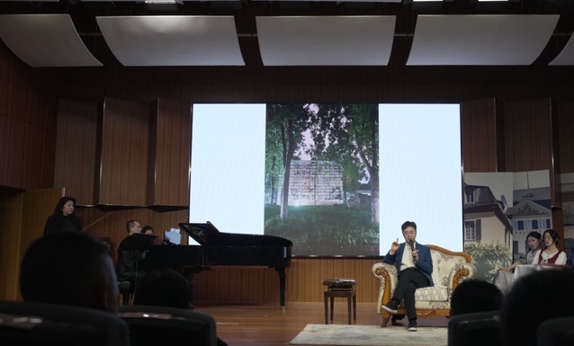 为营造能够使观众置身于文化语境的氛围,盛小华、季鹏精心设计了舞台布景。季鹏介绍了贝多芬的生平以及舞台布景的设计意图。(音乐学院)