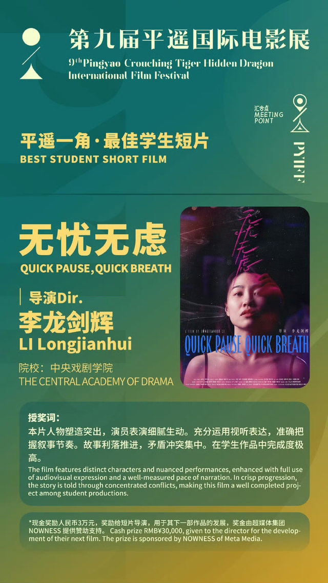 在第六届金鸡海峡两岸青年短片季中,由中央戏剧学院毕业的导演李龙剑辉执导,我校传媒学院录音艺术系系主任、副教授范翎和教师张源康担任声音主创,影视录音方向同学们共同参与声音后期创作的影片《无忧无虑》荣膺“新湾流计划年度短片奖”。在刚刚落幕的第九届平遥国际电影展上,《无忧无虑》从众多作品中脱颖而出,荣获“平遥一角·最佳学生短片”。评委会授予的授奖词中特别指出:“本片人物塑造突出,演员表演细腻生动,充分运用视听表达,准确把握叙事节奏。”这份对影片视听表达的认可,离不开我校录音艺术系师生团队在声音设计、环境塑造、人物情绪的声音刻画上所付出的专业努力与艺术探索。(传媒学院)