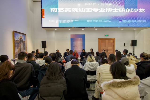 章文浩从学科建设与专业发展角度强调专业博士人才培养中既要重视专业创作实践能力,同时也要注重拓展学术视野,提升理论研究能力,做到“艺理双修”。陆庆龙认为人物画创作要求高、难度大,他强调对生活的观察和表现,并分析作品能够打动人的原因。陈坚指出了油画人物创作中造型的重要性,而主题性美术创作还应该完成从现实形象到艺术形象的转化;此外,他还提及了技艺操练的习作与主题创作之间的关系等问题。金田以自身创作为例,告诫青年学子需要寻找自己的创作方向,并挖掘自己的内心,同时要通过拓宽视野来为创作蓄能。封家樑介绍了设置专业博士人才培养的需求和南京师范大学美术创作类专业博士的培养情况。章文浩关注专业博士人才培养的专业性和创作能力提升问题,他指出学校管理部门和导师应该把控专博与学博的分类培养机制,让“学博更学术,专博更专业”。施煜庭从国家和学校层面,探讨了专业博士人才培养的机制,以及人工智能影响创作教学等师生关心的问题,她认为在专业研究生教学中需要传承与创新兼收并蓄。黄鸣提出了博士生创作应该增加研究过程的内容,坚定做深个人研究的内容,并在社会风向中把握好研究方向。刘春回顾了书法、雕塑、国画等博士研创沙龙专场的情况,强调专业博士的身份定位,呼吁专业博士的创作实践进一步呼应时代的要求。蓝剑认为博士研创沙龙推进了以创作实践为主导的高端人才培养机制,也建构起导师、行业名师、教学主管部门等和博、硕士研究生之间“师生共生”型的课堂范式。
