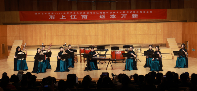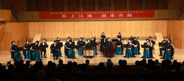 11月27日,2025年度国家艺术基金艺术人才培训资助项目“江南丝竹演奏人才培训”成果汇报音乐会“形上江南,返本开新”在南京艺术学院音乐厅举行。来自全国各省市民族乐团、专业音乐院校的30位学员,以灵动清雅的江南丝竹音乐,为本次培训画上圆满句点。项目负责人、南艺音乐学院院长王晓俊教授担任导聆。