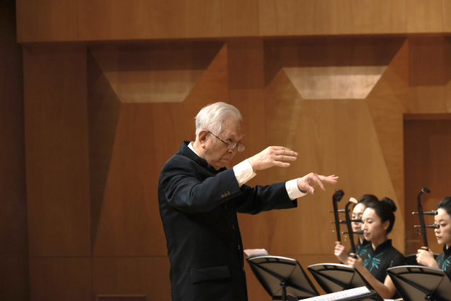 音乐会的压轴环节以小型乐器组合,无需指挥,依靠乐手间的默契配合完成演出。项目组还特邀83岁高龄的著名作曲家、上海民族乐团原团长、终身艺术顾问顾冠仁担任指挥。他以饱满的热情指挥以细腻“笔触”深描水乡秀美风光的《江南好》和大写意手法书写江南丝竹的《江南美》。最后,学员们加演了江南丝竹经典曲目《三六》,为音乐会划下圆满的句号。