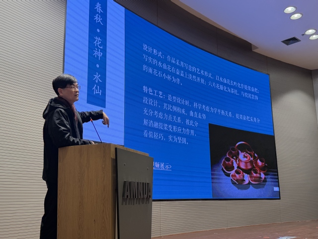 谢强教授以南京艺术学院校友与紫砂艺术家的双重身份,结合自身多年教学、行政及创作经验分享了他的艺术发展之路。他结合自身的作品,诠释了艺术创作需扎根传统文化、融汇时代精神,兼顾文化内涵、艺术设计与实用功能。