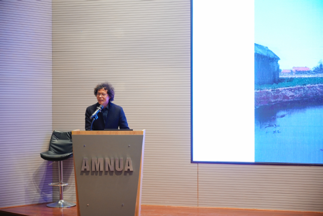 聘任仪式后,陆庆龙教授在美术馆报告厅举办专题讲座《小河弯弯,长江绵绵——平原水系中的文化基因》。陆庆龙教授以“小河”为切入点,视其为文明的“细胞”与长江文化的“毛细血管”。他结合自身长期在苏北平原的创作实践,分享了如何以绘画语言捕捉平原水系中的静谧与流动——通过“弯弯”的线条、温和的泥土色彩与质朴的情感表达,在平坦中寻找深度,构建出一种静穆而富有诗意的平原美学。