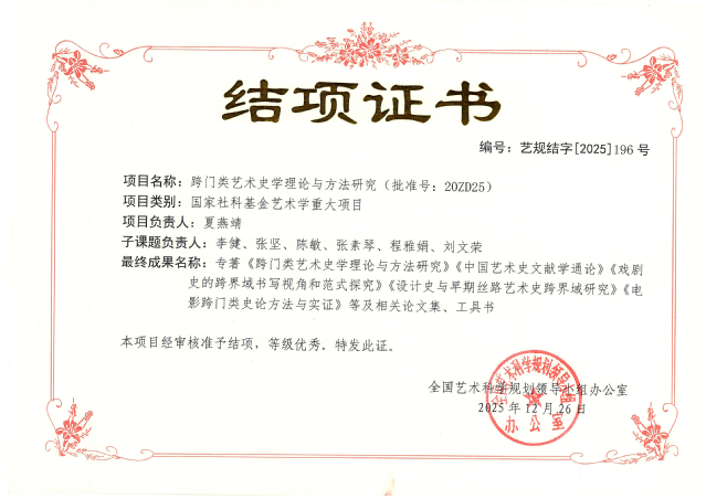 近日,我校接到全国艺术规划领导小组办公室公布的“国家社会科学艺术学基金项目结项评审结果”通知,由南京艺术学院夏燕靖教授担任首席专家的重大项目《跨门类艺术史学理论与方法研究》(批准号:20ZD25)顺利结项,获评优秀等级。这是我校国家社科基金艺术学重大项目结项首次获评优秀等级。