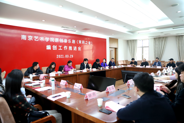 3月29日上午,我校召开原创音乐剧《茉莉之音》编创工作推进会。江苏省文联主席、南艺知名校友、剧目编剧、总监制章剑华,江苏省委宣传部文艺处副处长吴瑾,国家一级作曲家兼演奏家、东方歌舞团音乐总监及音乐指挥、南艺知名校友、剧目作曲卞留念,南京艺术学院党委副书记、校长、剧目艺术总监刘伟冬,校党委常委、副校长张捷,校党委常委、宣传部部长吉爱明等该剧主创及主演团队以及江苏大剧院副总经理顾平、江苏视野制造总裁杨寒松等校外合作单位代表参会。推进会由张捷主持。