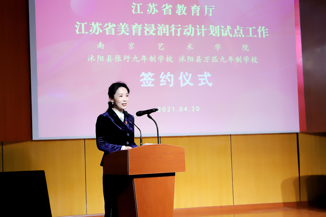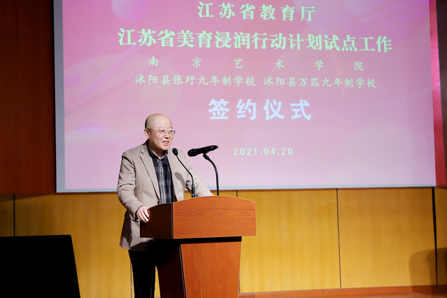 4月20日上午,江苏省教育厅美育浸润行动计划——南京艺术学院与沭阳县张圩九年制学校和万匹九年制学校的签约仪式在我校音乐学院演奏厅举行。省教育厅体卫艺处处长张鲤鲤,校党委常委、副校长张捷,校党委常委、宣传部部长吉爱明,沭阳县教育工委委员、县体育中心主任方坚,沭阳县两所学校的负责人和教师代表,我校艺创处、教务处、团委、美术学院、音乐学院等相关职能部门和二级学院负责人及师生代表一起参加了签约仪式。仪式由省教育厅体卫艺处三级调研员王红蕾主持。